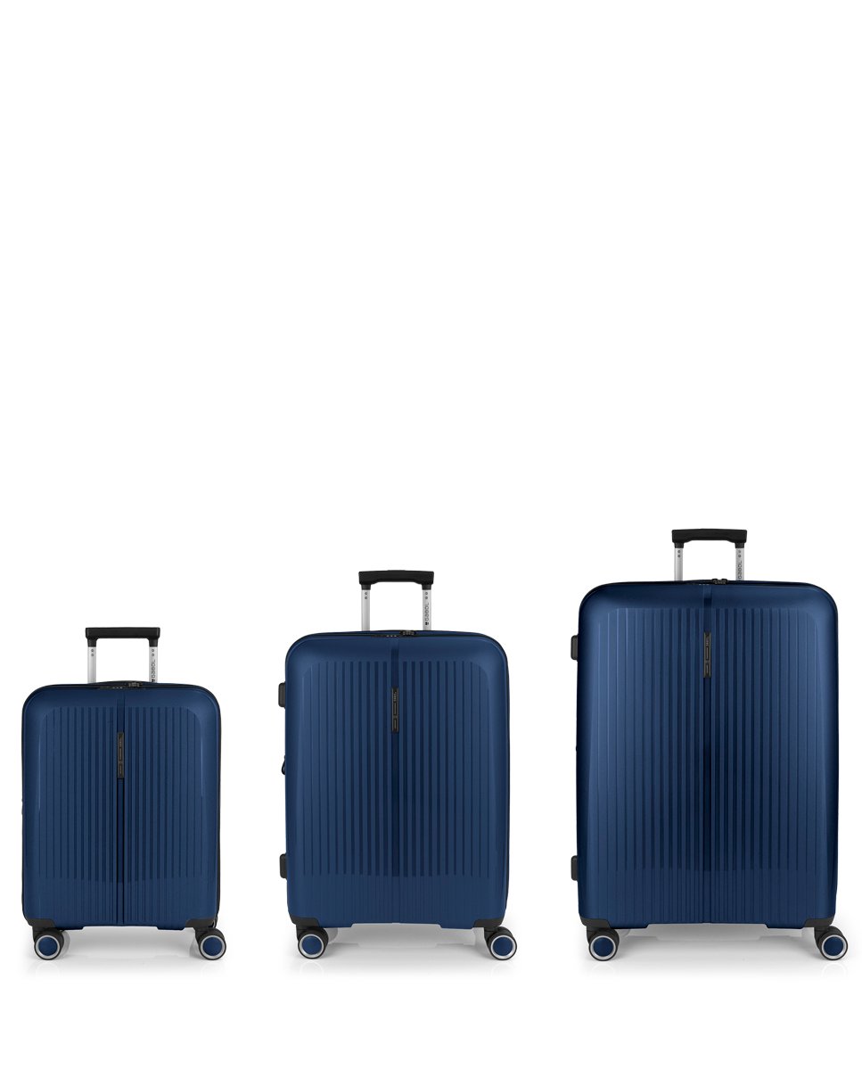 Juego de 3 maletas (Cabina, Mediana y Grande) rígidas y 4 ruedas dobles multidirección. Expandibles en todos los tamaños. Fabricadas en Polipropileno. Su interior esta compuesto por un forro de material reciclado, con doble separador y bolsillos. Cremallera de seguridad. Cerradura TSA. 10 años de garantía. Medidas sin y con expandible: Maleta Cabina: 40x55x22/25cm – Peso: 2,8 kg – Capacidad: 41,7/47,4 L. Maleta Mediana: 45x65x27/30 cm – Peso: 3,4 kg – Capacidad: 70/77,8 L. Maleta Grande: 51x75x31/34 cm – Peso: 4,5 kg – Capacidad: 109/119,6 L.