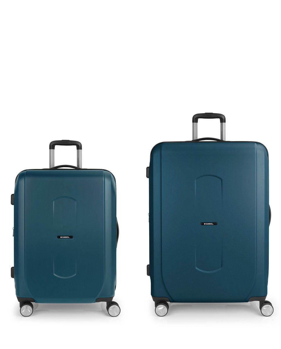 Juego de 2 maletas (Mediana y grande) rígidas, expandibles y 4 ruedas dobles multidirección. Fabricadas en ABS. Su interior está compuesto por un forro de material reciclado de alta calidad con separador y bolsillo. Cerradura TSA. Medidas sin y con expandible: Maleta Mediana: 47x67x28/31 cm – Peso: 3,8 kg – Capacidad: 88,2/97,6 L. Maleta Grande: 54×76,5×32/35 cm – Peso: 4,4 kg – Capacidad: 112,6/123,1 L.